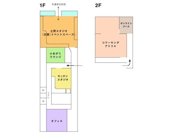 1階の土間スタジオは、物販・ワークショップ・イベントなどができるフレキシブルなスペース。ショーウィンドウは、元履物店の大きなショーケースを活かした展示・販売スペースだ。まちに開かれた発信の場として利用できる。キッチンスタジオは、営業許可取得予定のため、ポップアップ出店や、飲食の提供が可能だ。小あがりラウンジは、靴を脱いでくつろげる畳スペースで、打ち合わせやお茶会、イベントでの利用ができる。子ども連れにも安心だ。土間スタジオ、小あがりラウンジ、キッチンスタジオはレンタルスペースとして、時間貸し利用が可能となる。