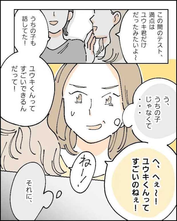 「この間のテスト、満点はユウキくんだけだったみたいよ~」「うちの子も話してた!ユウキくんってすごいできるんだって!」ママ友たちから話を聞いて、「う、うちの子じゃなくて・・」と思いつつ、「へ、へぇ~!ユウキくんってすごいのねぇ!」と言った後、「それに、」