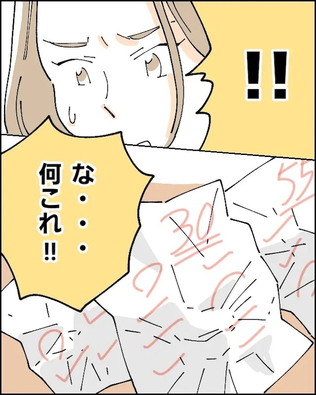 すると「!!な・・何これ!!」引き出しの奥から出てきたのは何枚もの答案でした。しかも、30点、55点・・と今まで見たこともない点数が並んでいました。