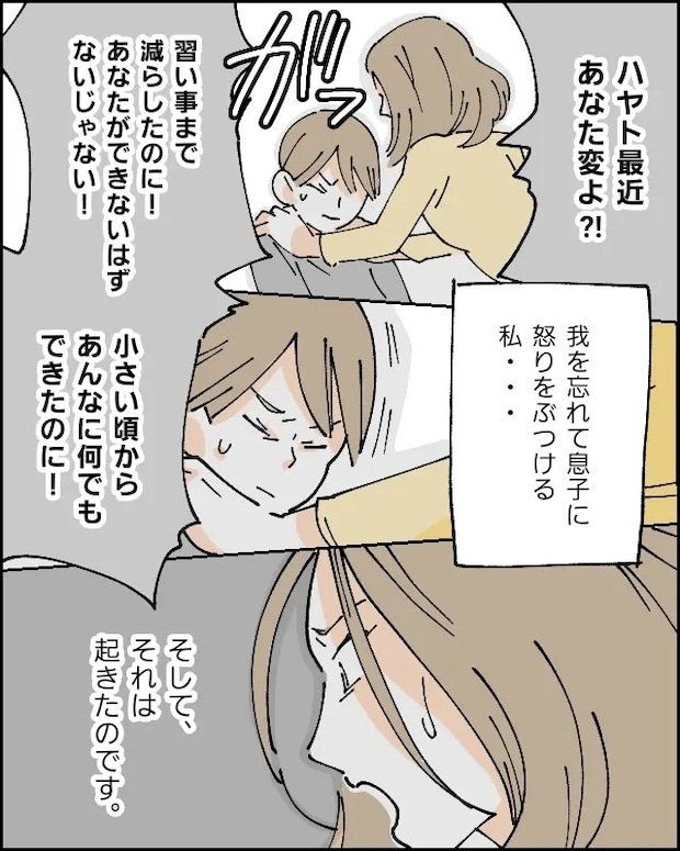 「ハヤト最近あなた変よ!?習い事まで減らしたのに!あなたができないはずないじゃない!小さい頃から、あんなに何でもできたのに!」我を忘れてハヤトの肩を掴み、怒りをぶつける私・・。