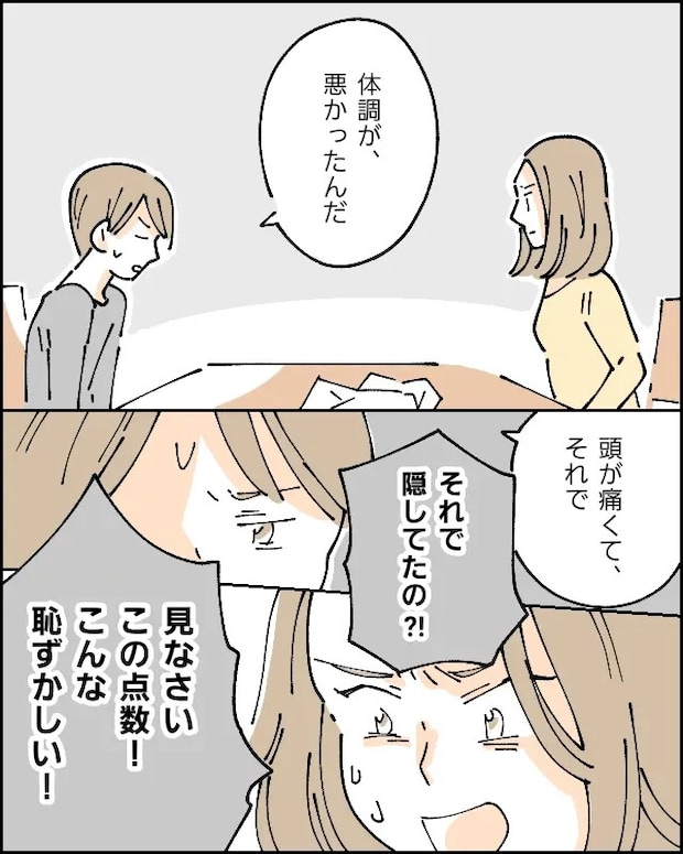 「体調が、悪かったんだ。頭が痛くて、それで」ハヤトが言い終わらないうちに、「それで隠してたの!?見なさいこの点数!こんな恥ずかしい!」と詰め寄った私は、