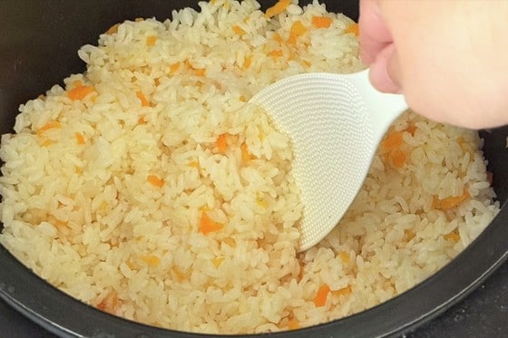 1. まずはバターで炒めたにんじんのみじん切りと米、コンソメを炊飯器に入れて炊き込みピラフを作ります。