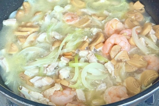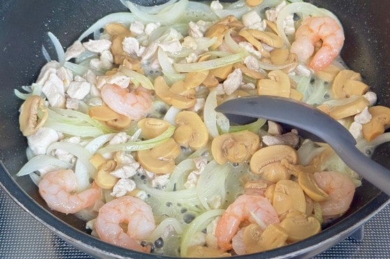 2. フライパンにバターとサラダ油を熱し、玉ねぎと鶏肉を入れて炒めたら、缶詰のマッシュルームとエビを加えてさらに炒めます。