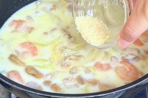 4. 牛乳を加えて弱火で熱したら、粉チーズを加えてよく混ぜます。
