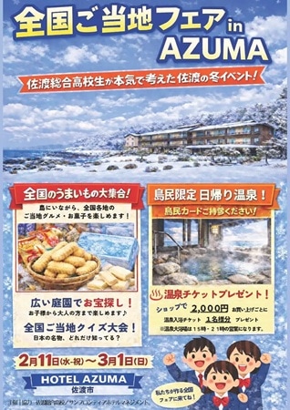 サンフロンティア不動産のグループ会社であるサンフロンティアホテルマネジメントと、サンフロンティア佐渡は、2月11日(祝・水)~3月1日(日)の期間、佐渡総合高校2年生が企画した冬季の地域活性を目指す島民参加型イベント「全国ご当地フェア in AZUMA」を、サンフロンティア佐渡が運営する、新潟県佐渡市にある「HOTEL AZUMA」で開催する。