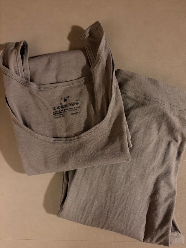 化学繊維の発熱機能下着を着用すると、夕方には湿疹が出てしまうので、あったかインナーはずっとこの無印良品の【綿100% あったか綿】シリーズをリピートしています。薄手で伸縮性があり、着心地抜群なのはもちろん、服のラインに響かない点もお気に入りです。長袖のクルーネックタイプは特に薄手のニットの下にこれ以上ないパートナーになってくれます!