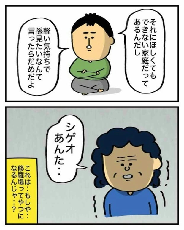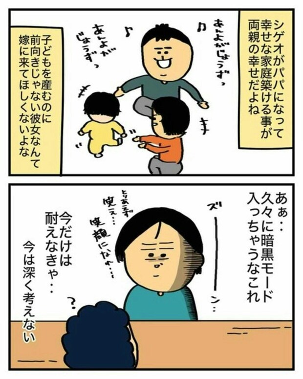 そんな中、彼の母親からの「孫が見たい」という一言が、エクボさんにプレッシャーとしてのしかかります。エクボさんの様子を察したシゲオさんが「でも…」と続けた言葉とは…。
