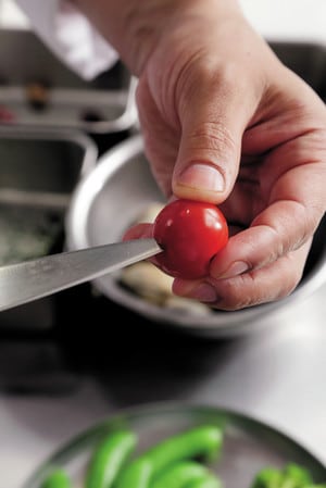 2. ミニトマトはへたを取り、包丁の切っ先を2か所に刺して果汁を出しやすくする。