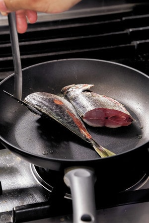 3. フライパンにE.V.オリーブオイルをひいてあじをのせる(盛り付けた時に表になる面を下に)。中火にかけて焼き始める。火のあたりにくい縁の近くは魚の片側を持ち上げ、全体を均一にこんがりと焼く。裏返しにして同様に焼く。