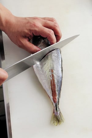 1. あじは、ぜいごとうろこ、ひれを取り、内臓を抜いて水洗いする。身の中央で筒切りにする。
