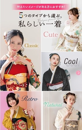 クラシック・キュート・レトロ・ナチュラル・クールなど、なりたい雰囲気別に振袖をセレクト。自分の「好き」や世界観に合った一着が直感的に見つかり、初めての振袖選びでも完成形がイメージしやすい。