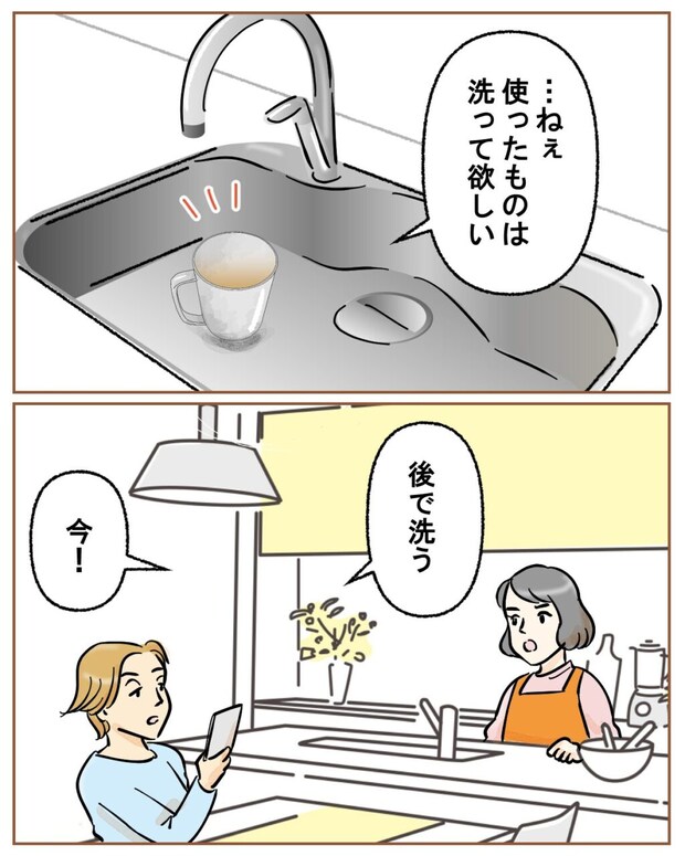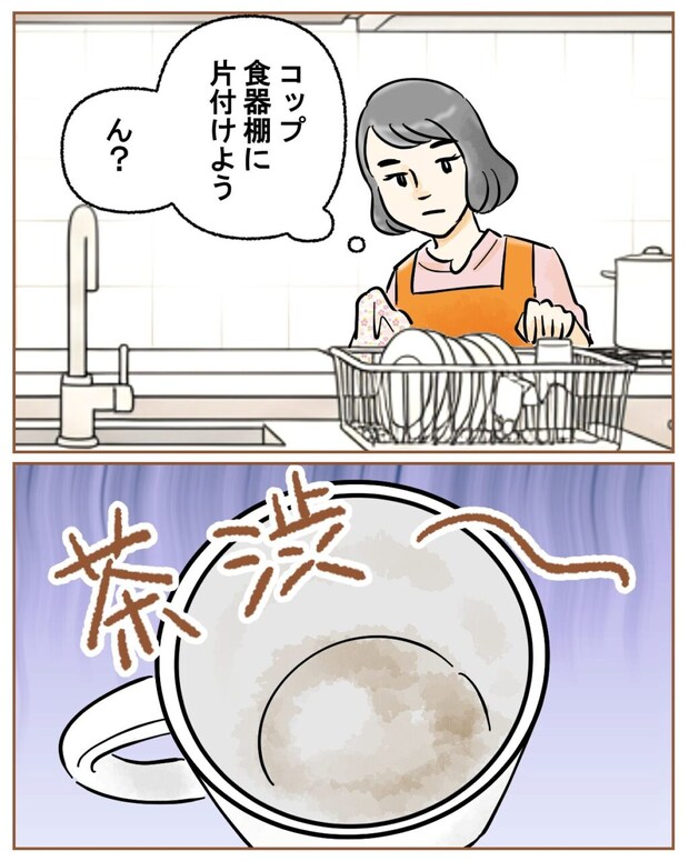 ある日のこと。シンクに洗わずに置かれたカップを見て「使ったものは洗って欲しい」と言ったナズナさん。「後で洗う」と全く洗う気のない返事に「今!」と言うと、ツカサさんは渋々ながら洗うことに。「言わなくてもできるようになってほしい」と思うナズナさんがカップを見ると、茶渋だらけ。ツカサさんは文句ばっかり言ってないで、やるべきことをさっさとやればいいのに!ナズナさんの心が疲弊してしまいますよね。