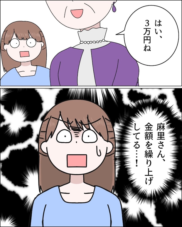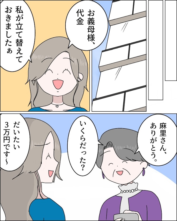 「お義母様、代金私が立て替えておきましたぁ」麻里さんがそう言うと、「麻里さん、ありがとう。いくらだった?」と笑顔でお礼を言うお義母さんに、「だいたい3万円です~」とざっくりした金額を伝える麻里さん。