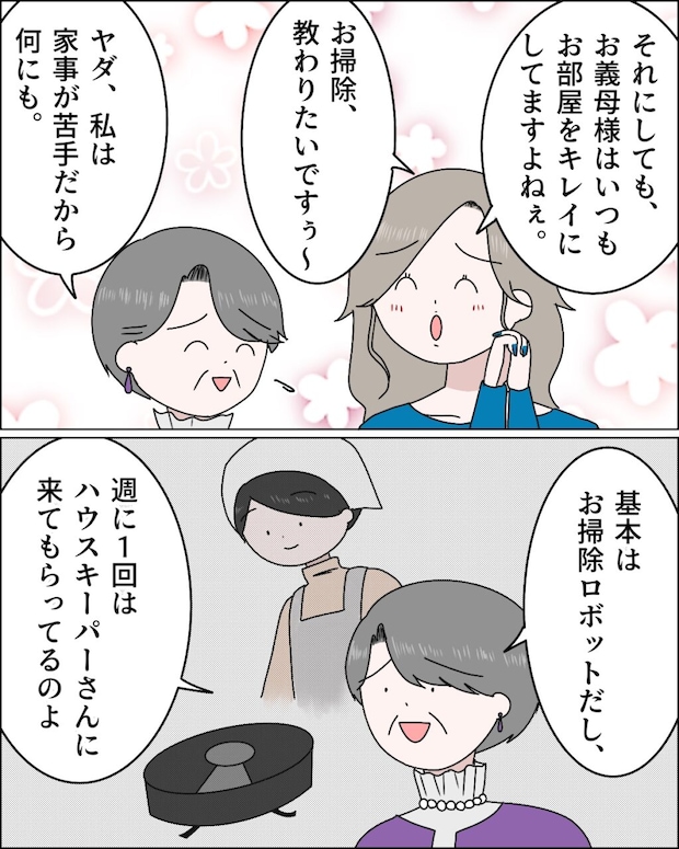 「それにしても、お義母様はいつもお部屋をキレイにしてますよねぇ。お掃除教わりたいですぅ~」麻里さんが甘えながらお義母さんにそう言うと、「ヤダ、私は家事が苦手だから何にも」と謙遜するお義母さん。「基本はお掃除ロボットだし、週に1回はハウスキーパーさんに来てもらってるのよ」と言うと、