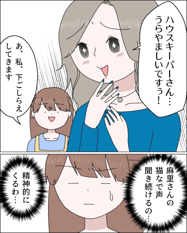 「ハウスキーパーさん・・うらやましいですぅ!」と目を輝かせ甘えた声で話す麻里さんの後ろで、「あ、私下ごしらえしてきます」と声をかけた私。「麻里さんの猫なで声聞き続けるの・・精神的にくるわ・・」となんだかげっそりしてしまいました。