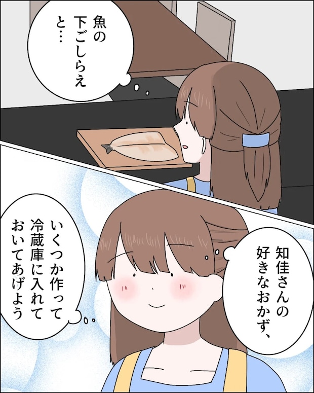 そしてキッチンへ行き「魚の下ごしらえと・・」そう呟きながら、「知佳さんの好きなおかず、いくつか作って冷蔵庫に入れておいてあげよう」そう考えて、なんだか嬉しい気持ちになったのでした。