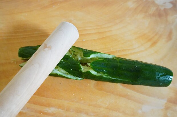 2. きゅうりは両端を切り落とす。塩をまぶして板ずりをして、めん棒などで叩いて割る。