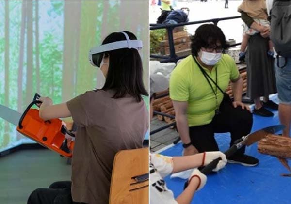 最新のVR機器や、本物の丸太やのこぎりを使った林業体験では、リアルとヴァーチャルの両方を体感できる。