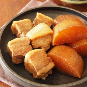 <材料> 豚バラ肉(ブロック)、大根、しょうが、○しょうゆ、○酒、○砂糖、○みりん