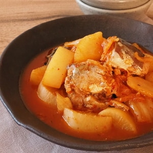 <材料> サバ缶詰(水煮)、大根、キムチ、○みりん、○和風顆粒だし、味噌、ごま油