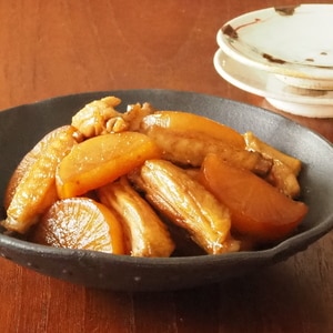 <材料> 鶏手羽中、大根、ポン酢、みりん、砂糖、しょうがチューブ