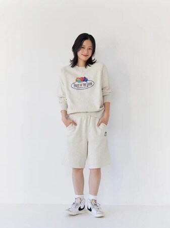 「FRUIT OF THE LOOM別注 ロゴスウェット」9,350円(税込)と「FRUIT OF THE LOOM別注 ロゴスウェットハーフパンツ」7,700円(税込)はアイボリー、ネイビーを用意。