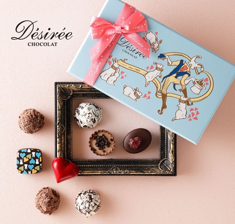 デジレー「ショコラ&トリュフ 8個入」には、伝統の「トリュフ」のほか、ココアクリームをホワイトチョコフレークで贅沢に飾った新作トリュフ「スノーフレーク」、日本オリジナルテイストの「レッドハート」、新作のカリッと食感のブラウニーが印象的な「ボストン」、カカオの香り際立つ新登場のダークチョコレート「ラパン・ブラン」、クランベリーがアクセントのチョコレートムース「マラガ」を、“ウサギのテーマパーク”をイメージした、心弾むボックスに詰め合わせた。
