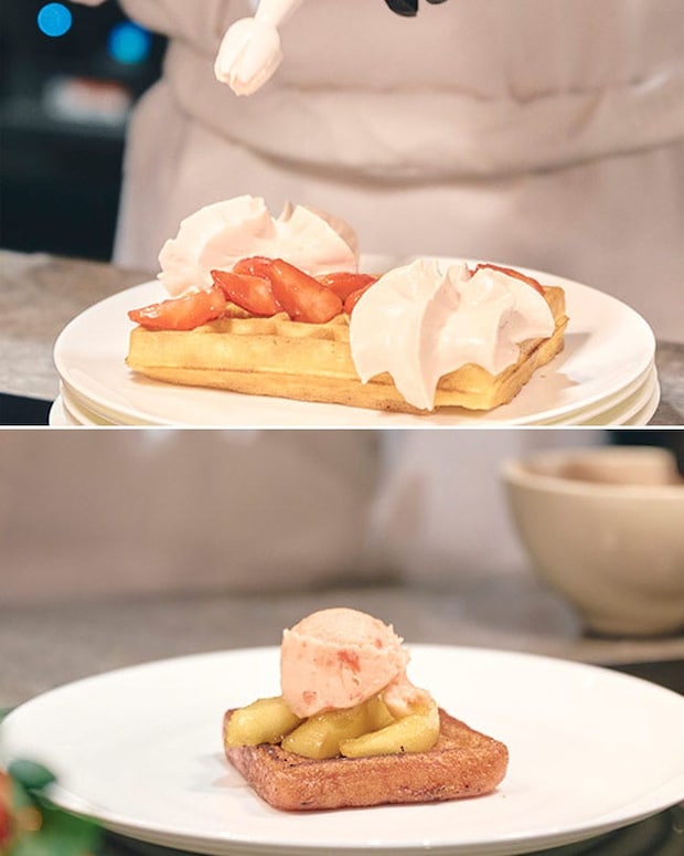 パティシエがしっとりふわふわに焼きあげるフレンチトーストも必食。芳醇な香りが広がるアップルフランベと、爽やかなストロベリーソルベの味わいが重なり合う、ライブ感たっぷりのおいしさをご賞味あれ。