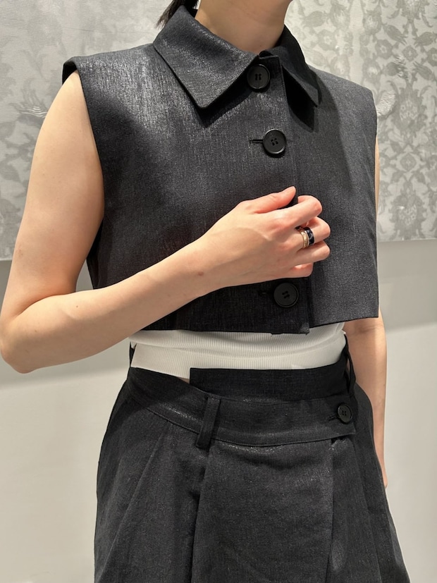 「カジュアルなアイテムでも女性らしい素材やディテールにこだわりがあるブランド、コラム。クロップドジレはリラックス感がありながらも、ハリのある素材でレポシのリングとも合うのでお気に入りです」ジレ¥50,600、パンツ¥48,400、インナー¥19,800(全てコラム)