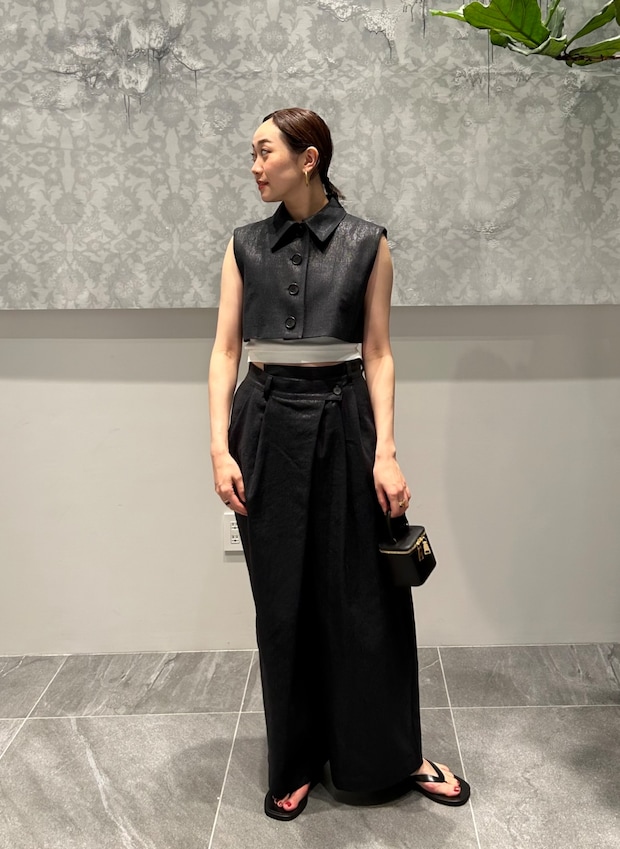 「光沢感のあるリネンのセットアップにクロップド丈のインナーを入れ、少し肌見せをすることで軽さを出しました。素材がリネンでカジュアルな印象もあるセットアップなので、ゴールド金具がさり気ないウィズ グッド シューズのナノバニティバッグに、ザ・ロウのサンダルを合わせてモード感をプラスしました」