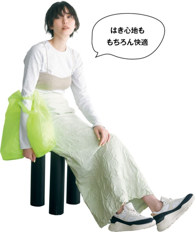 スニーカー※ポップアップ別注¥41,800(デイト/ティースクエア プレスルーム)、ボディスーツTシャツ¥2,990(ザラ/ザラ カスタマーサービス)、キャミソール¥24,200、スカート¥46,200(共にオーラリー)、バッグ¥6,600(サンディニスタ/トゥー・ステップ)