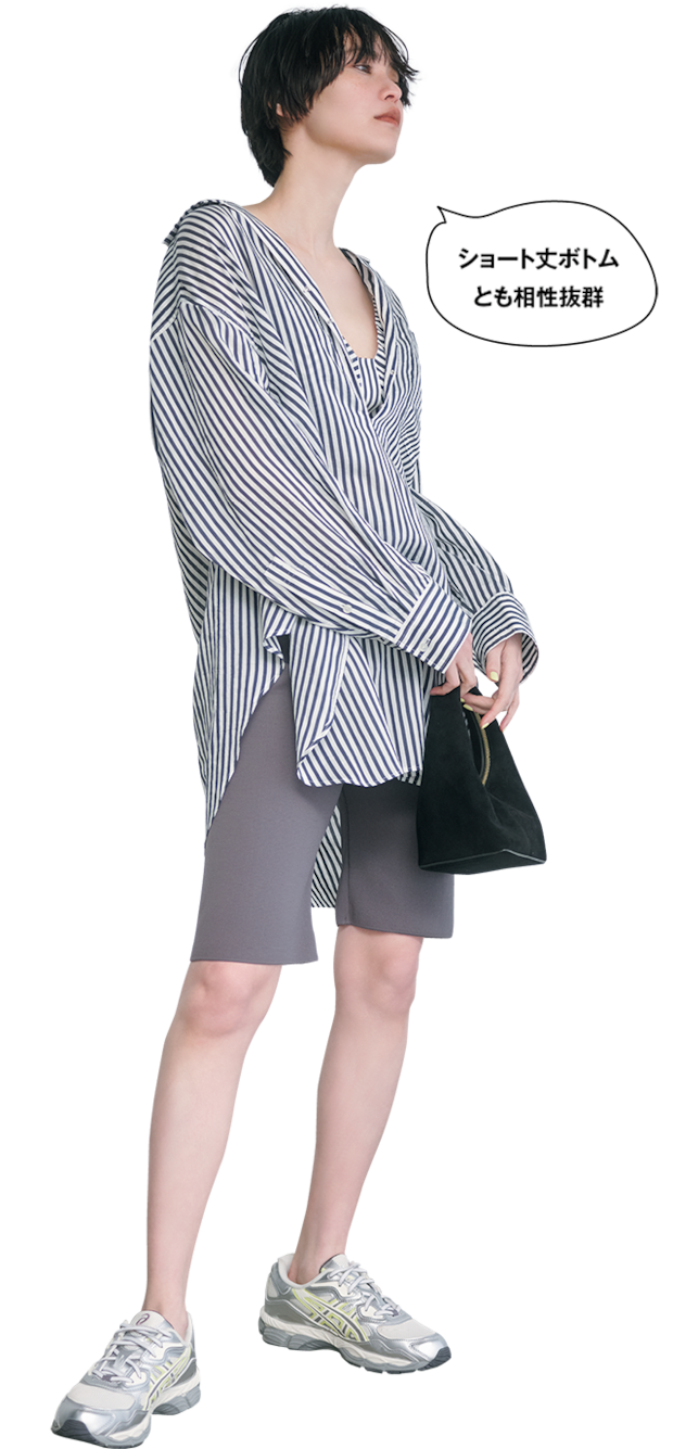スニーカー¥18,700(ASICS for emmi/エミ ニュウマン新宿店)、シャツ[ブラトップとセット]¥42,900(ベニット/ノーブル 有楽町マルイ店)、レギンスパンツ¥27,500(ジェーン スミス/RHC ロンハーマン)、バッグ¥68,200(フランツロアー/ガリャルダガランテ 青山店)