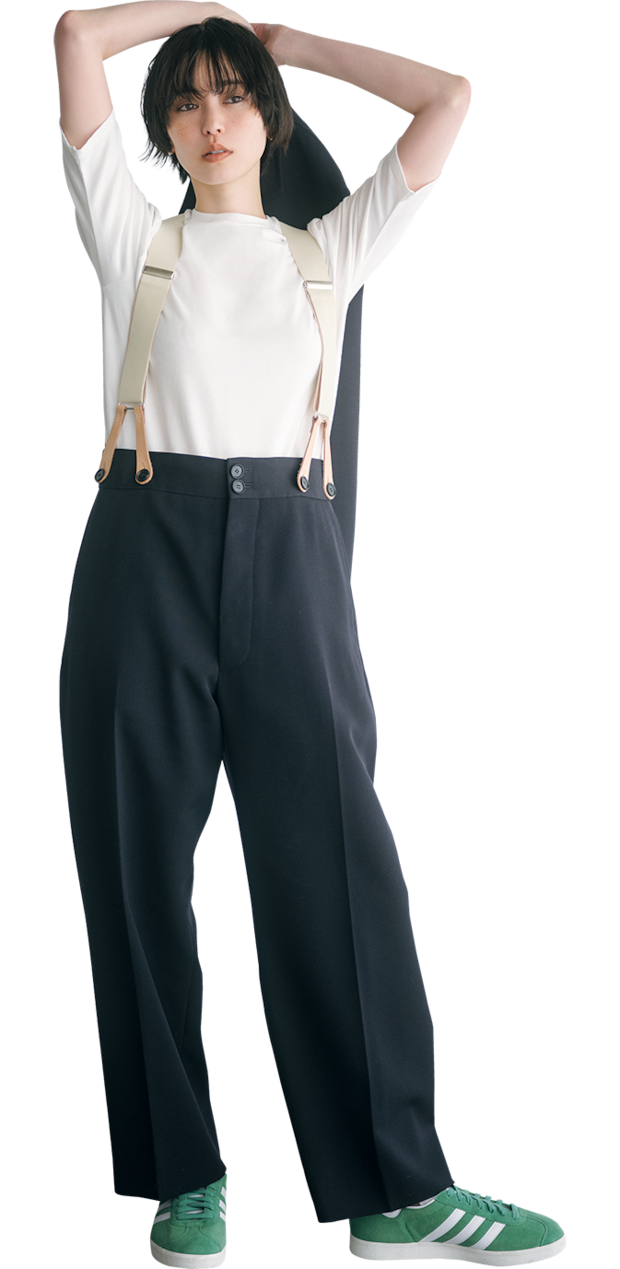 スニーカー¥15,400(アディダス/アディダスお客様窓口)、Tシャツ¥16,500(ザ・ニューハウス/アーク インク)、パンツ¥52,800、手に持ったジャケット¥107,800、サスペンダー¥12,100※全てメンズ(全てヒューベント/アルファ PR)、ピアス¥12,650(ブリー レオン/ジャック・オブ・オール・トレーズ プレスルーム)