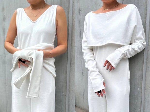 「繊維廃棄物質を回収し粉砕したGRS認証のリサイクルコットン〈Recover〉とOCS認証のオーガニックコットンをブレンドし紡績した上質なスエット素材を使用したブランド定番人気のアイテムです。ロンパースは1枚で着ても下着が出ないよう胸、背中、脇のあきを絶妙に計算し、上品な肌見せが叶うシルエットに設計。ボレロはとくに万能アイテムで着たり羽織ったり首や体に巻いたりとアレンジは無限大。思わず頬擦りをしたくなるほど肌触りのよい上質素材です」ロンパース¥24,400、ボレロ¥9,900(共にミュエット)