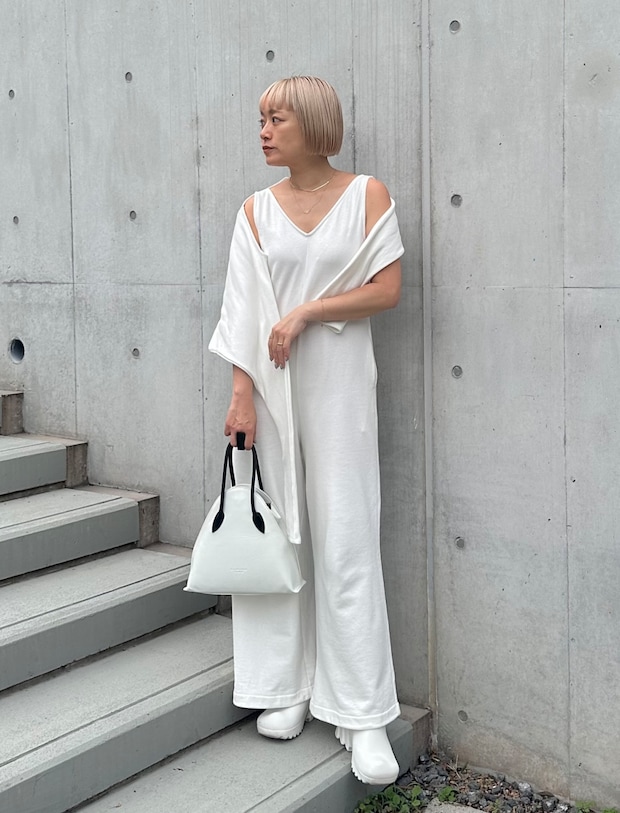 「ロンパースとボレロ、珍しい組み合わせのセットアップは、ボレロを肩から斜めに掛けてアレンジしました。足元まで潔くオールホワイトで統一したコーディネートは、バッグのハンドルのブラックだけをさり気なくポイントにしたモノトーンスタイル。華奢なジュエリーをきかせて女性らしさも」
