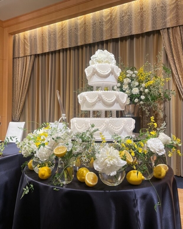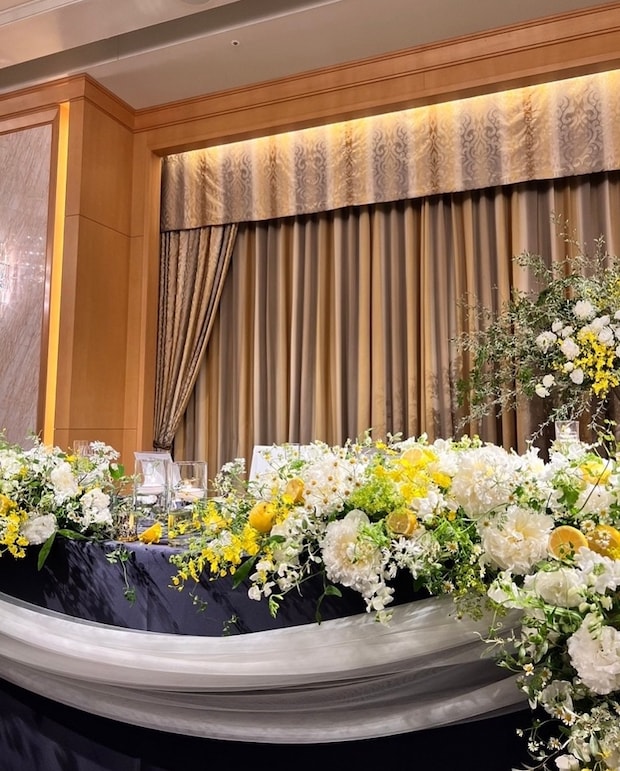 結婚式の装花のイメージはシチリア。彼の好きな旅先がシチリアだったので、生のレモンを使ってもらって、シチリアを彷彿させるような装花にしました。