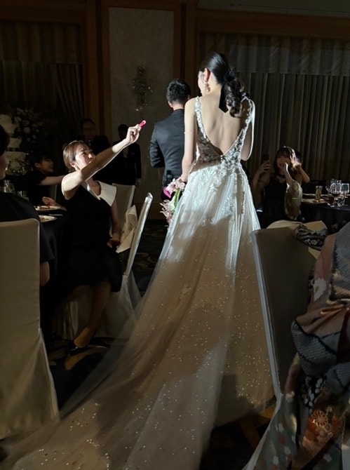 個人的な話にはなりますが、お色直しにはグリッドのキラキラしたドレスを選びました。それに合わせてブーケもチェンジし雰囲気をガラッと変えました。