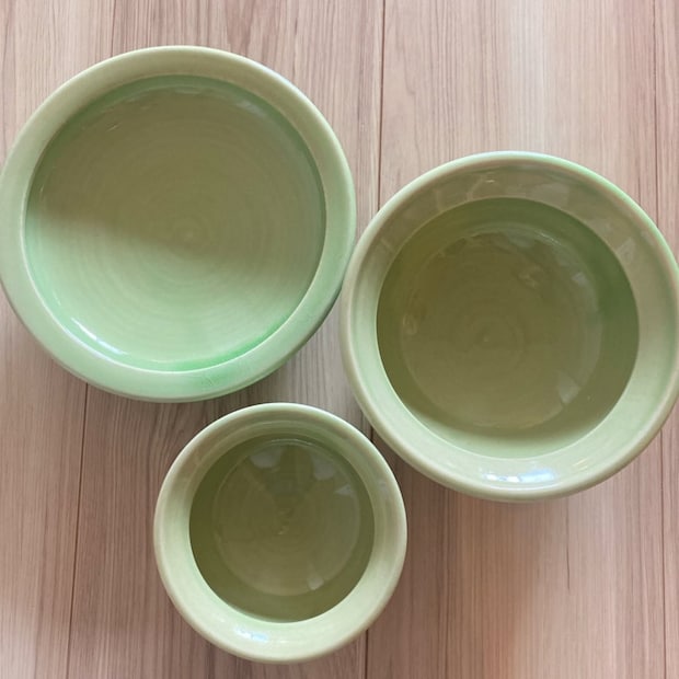 グリーンと白がいにま陶房の食器です。