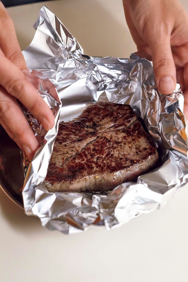 焼いた牛肉はすぐに切らず、アルミホイルで包んで保温を! 一旦休ませることで肉汁が流れ出るのを防ぎ、しっとりとした口当たりに。