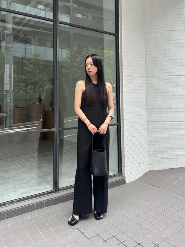 「アメスリで女っぽくモードな印象のオールインワンは、デザイン性はありつつもシンプルなので存在感のあるアクセサリーをつけてコーディネートしたのがポイント。重い印象にならないように足元はオープンスクエアトウで肌を程よく見せ、ヌケ感を出しました。バッグは表面にシボ感のあるものを合わせて、のっぺりしないようにバランスよくまとめました」