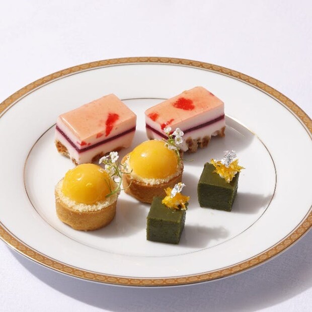 中段に並ぶのは、「桜とチェリーのチーズケーキ」や「ミモザ風レモンタルト」、「抹茶のテリーヌ」など見た目でも春を楽しめるスイーツの数々。目で楽しんだ後は、爽やかで優しい味わいのハーモニーで春の訪れを感じてみて。