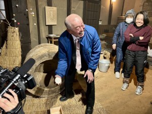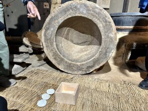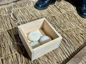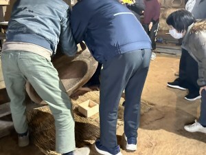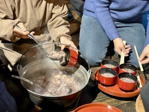 体験を終えたあとは、再び囲炉裏を囲み、小豆粥の振る舞いをいただきました。お供えのお餅が入った小豆粥は、素朴でやさしい味わい。松笠屋敷の落ち着いた雰囲気も相まって、昔の暮らしに思いを馳せるような時間となりました。