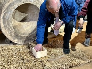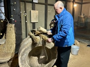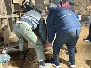 まずは、藁を柔らかくする作業から。臼を使い、藁を筒棒で叩いていきます。通常は2人で向かい合い、テンポよく叩くのだそうです。