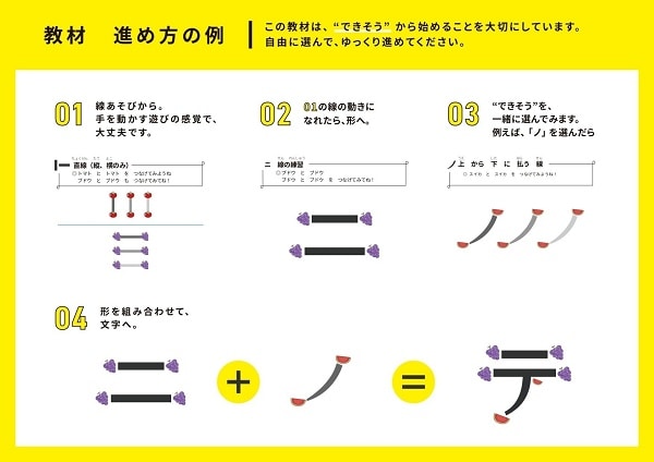 クリスタリア式 文字学習教材『たすたすドリル すてっぷ0~せんとかたち・カタカナ編~』の開発者は、こうした“つまずき”に目を向け、比較的簡単なカタカナから始め、「線→形→文字」という、形を組み合わせていく構造で学べる教材づくりに取り組んできた。