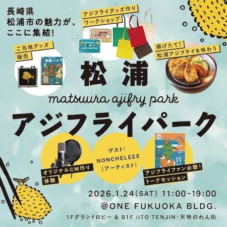 2023年に初開催され、福岡市内で2回開催してきた「松浦アジフライパーク」も同時開催される。今回は、ONE FUKUOKA BLDG.で初の開催。アジフライグッズ作りワークショップ、ご当地グッズの販売、トークセッションなど、さまざまな企画が行われる。