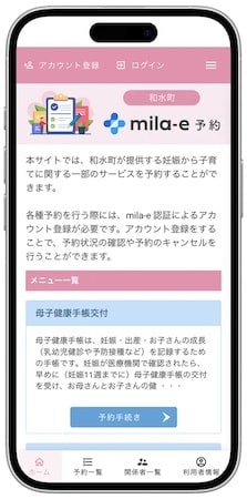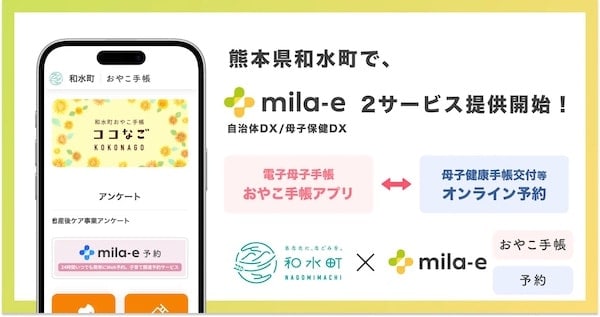 熊本県玉名郡の和水町では、「ミラボ」が開発する自治体向けサービス・母子手帳アプリ「mila-e(ミライー) おやこ手帳」、オンライン予約サービス「mila-e 予約」を導入し、1月14日(水)より運用を開始した。