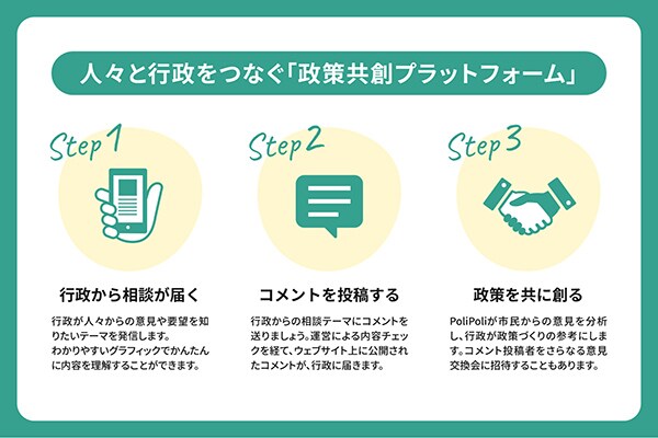 その仕組みは、まず行政から政策に関する相談が届き、それに対して住民は意見やアイデアを投稿したり、共感するコメントに「いいね」をしたりする。集まった意見はPoliPoliが分析し、行政が政策づくりの参考にするという流れだ。
