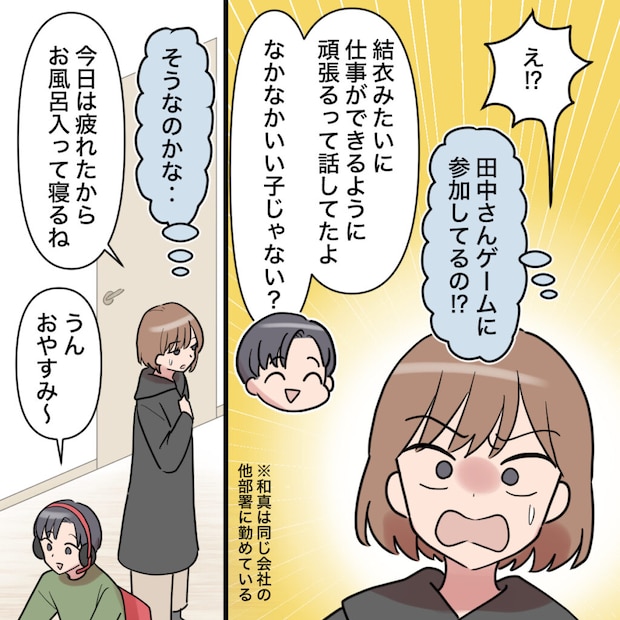 「なぁなぁ、美咲ちゃんって結衣が教育係になってる子?」和真に突然そう聞かれ、私は戸惑いながら「え・・・そうだけど、どうしたの?」と返します。すると彼は、「このゲームのメンバーに今日から入ったからさ」と聞かされます。思いがけない繋がりに、私は驚いてしまいました。