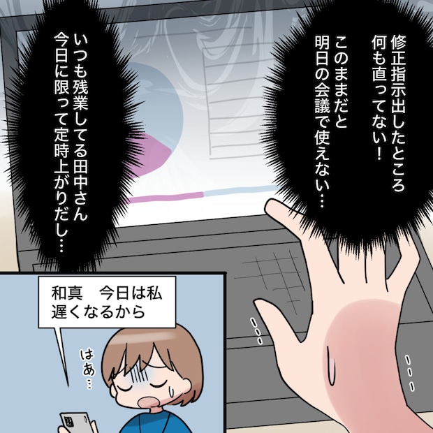 なんと、数日前に修正指示を出した箇所が何も直っていなかったのです。このままだと明日の会議で使えません。田中さんに再度修正をお願いしようにも、今日に限って定時上がり。もう自分で直すしかない。私は大きくため息をつきながら、和真に「今日は遅くなる」とメッセージを送りました。