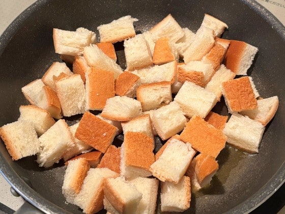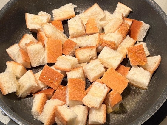 3. 溶けたら、パンの耳をフライパンに入れます。このとき、しばらく動かさないのがポイント。両面にしっかり味がつき、香ばしく仕上がります。